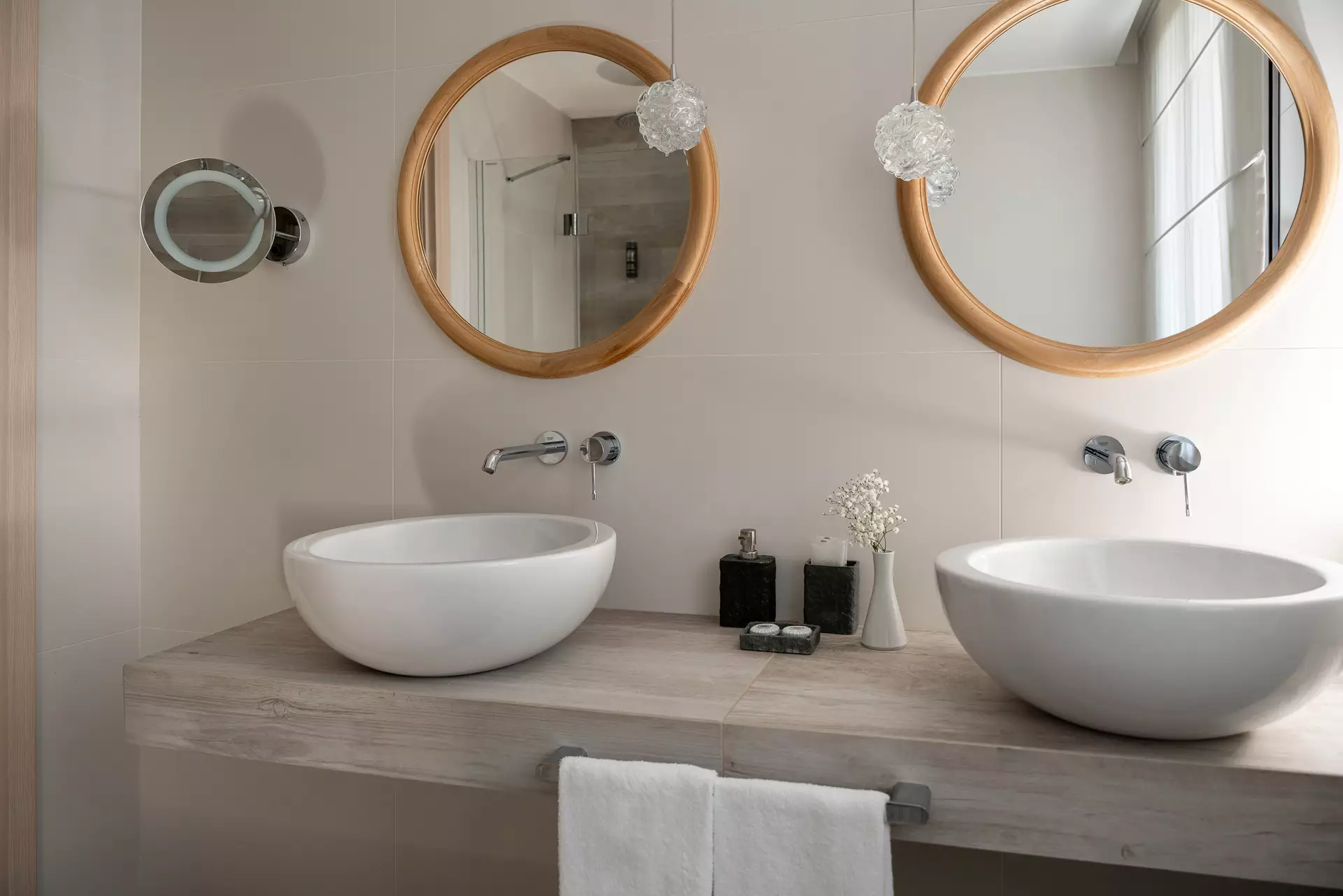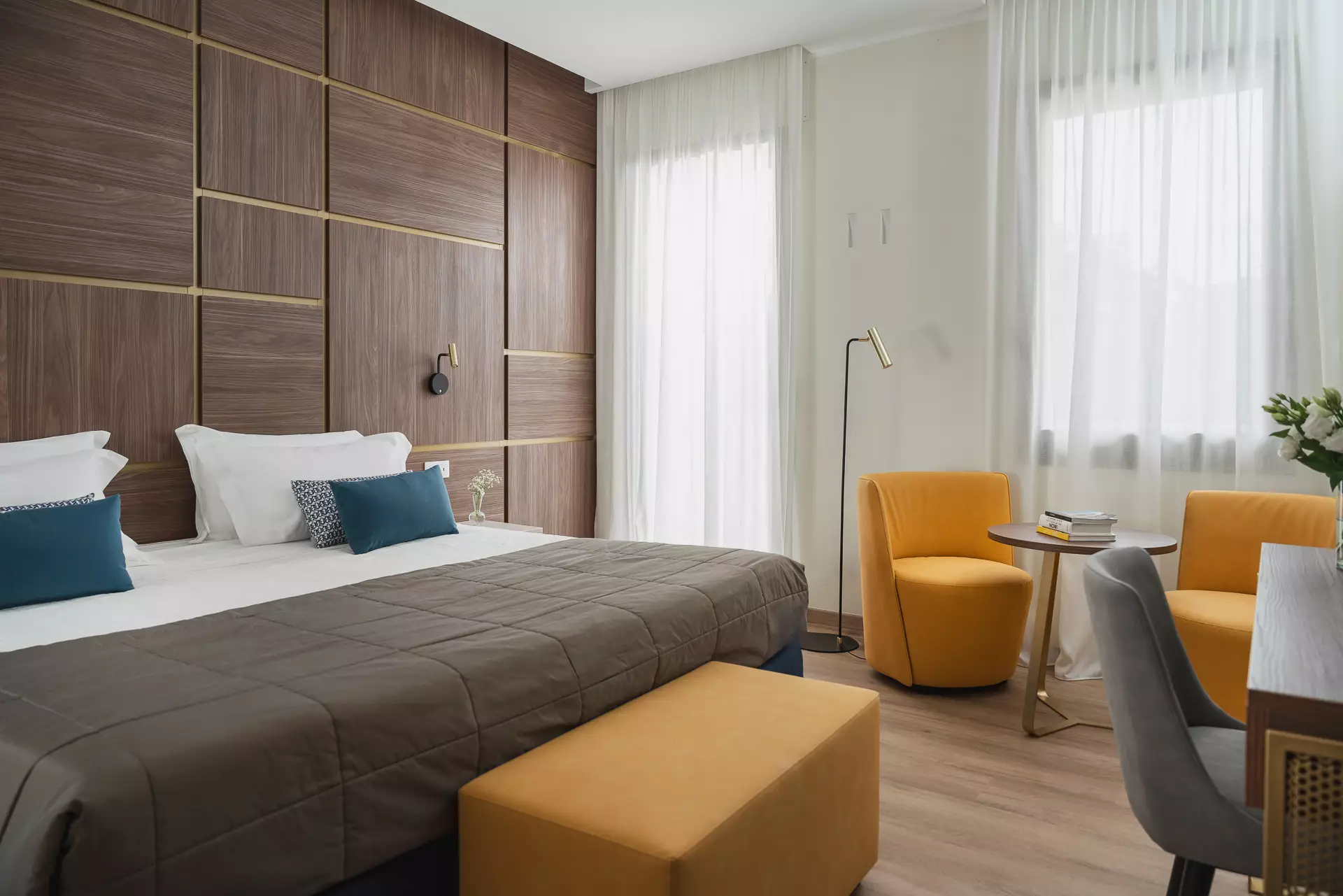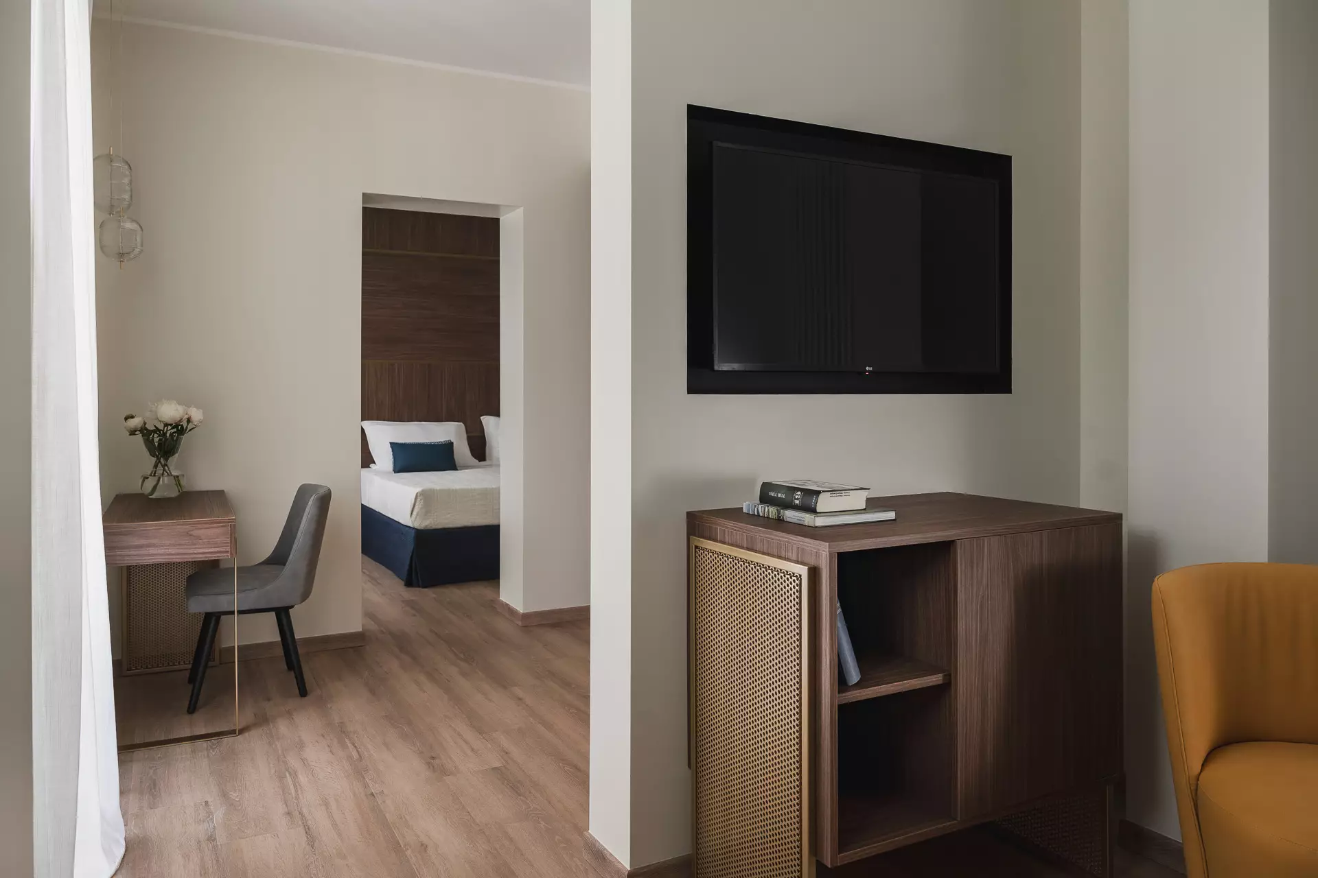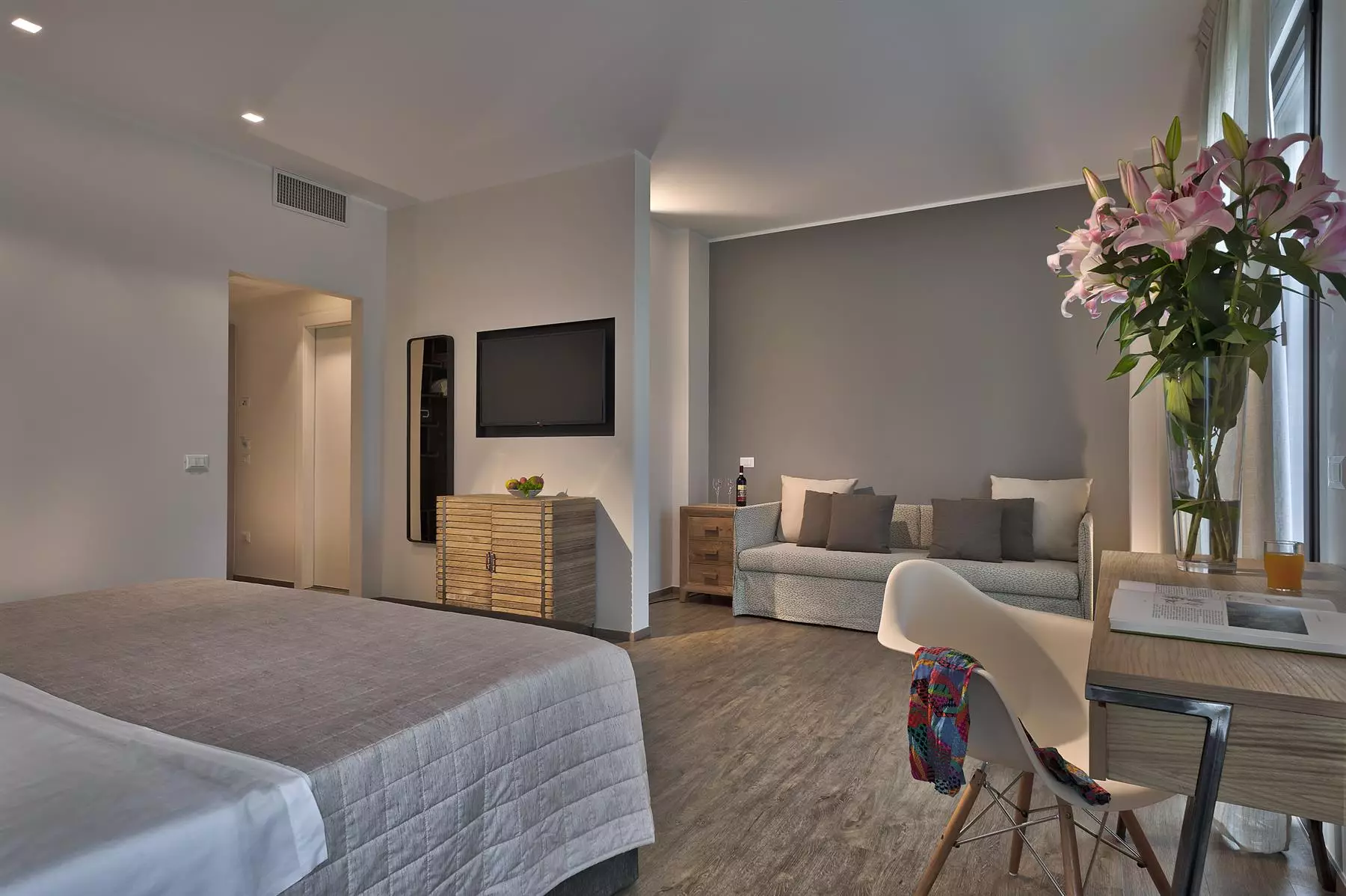 Die Einrichtung zeichnet sich durch einen überwiegenden Anteil an Holz, wesentliche Merkmale, sanfte Farben und raffinierte Details aus.